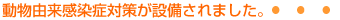 | 「動物由来感染症」とは、ペットなどの動物から人に感染する感染症の総称です。近年のペットブームによりクローズアップされている「動物由来感染症」は、重荷病原体を保有する動物との緊密な接触により感染します。 |